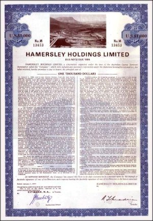Beautifully engraved certificate from the Hamersley Holdings Limited issued in 1977. This historic document was printed by the American Banknote Company and has an ornate border around it with a vignette of a factory. This item has the printed signatures of the Company’s Director and is over 24 years old.