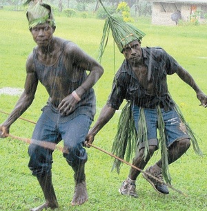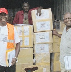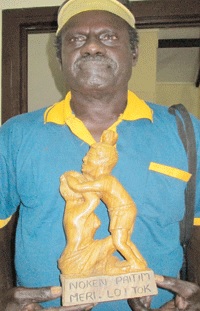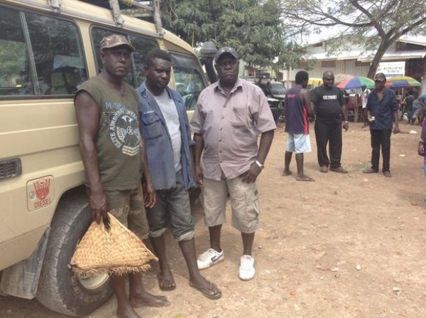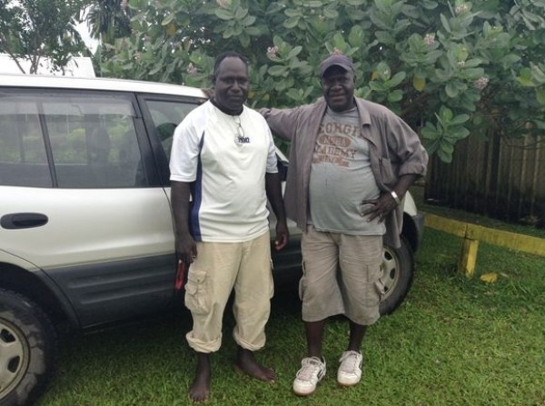 Picture of Ausaid Rep on Bougainville,DEO MWESIGYE and Chris Uma pose for this Laukai picture at Panguna