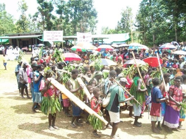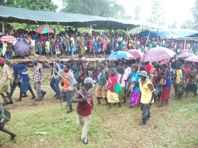 Siwai group from Monoitu carried a live Pig to the ceremony with the group carrying it on a uprooted palm tree with its roots and leaves intact.