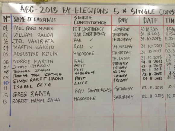 PAUL PARO FOR PEIT,WILLIAM RAUOVI FOR RAO,JOEL VAVIRIATA FOR RAO,MARTIN KAKITO FOR RAO,AUGUSTINE RETEIN FOR HAGOGOHE,NORRIE MARTIN FOR RAO,JIMMY GIBSON FOR PEIT,THOMASS SOAGAI FOR PEIT, THOMAS TOM KATHOA FOR HAGOGOHE,SIMON RAKEIT HAONI FOR PEIT,ISABEL BETA FOR LULE,GREG RAIVIA FOR RAO and JULIAN NOGOS for PEIT.