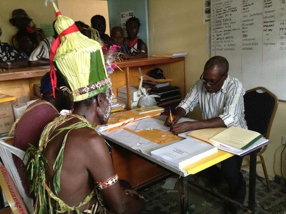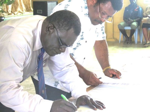 Pictured are the two chiefs, CHRIS SIRIOSI and SIR MANAZUPE ZURENUOC signing the documents at the Hutjena Secondary School Hall last Friday.