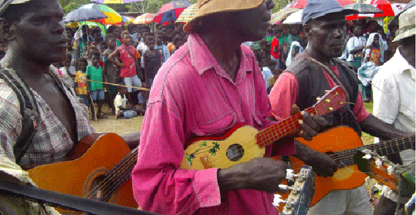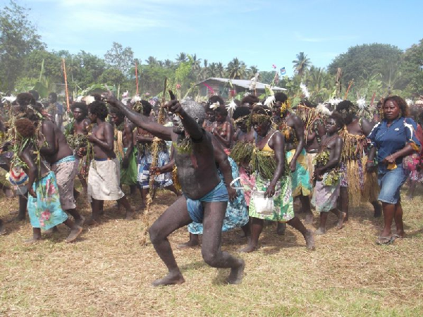 Picture of Kunua Cultural Group arriving for the Reconciliation ceremony between former BRA man GLYN TOVIRIKA and Resistance Fighter and Now Acting Chief Administrator, CHRIS SIRIOSI at Waropa village in Tinputz yesterday.