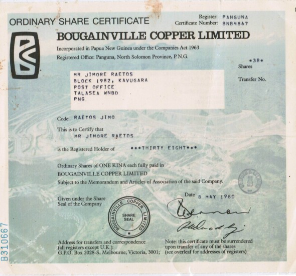 Since many years the European Shareholders have been hunting for pictures of hardcopy shares of Bouganiville Copper Limited (BCL). Today, an unexpected email reached the ESBC.It contained two copies of the original Bougainville Copper shares (pictured).They are supposed to value still the amount of shares indicated. Nevertheless: Since BCL decided to issue virtual shares only, these shares have to be considered as collectible items. Unfortunately BCL shares are not as attractive as some classical shares issued by big companies in the beginning 20th century. But, for people who entertain friendly relations to Bougainville, these shares might represent a special nostalgic value as a souvenir of better days. Now it's up to Bougainvilleans to make these better days come back again!